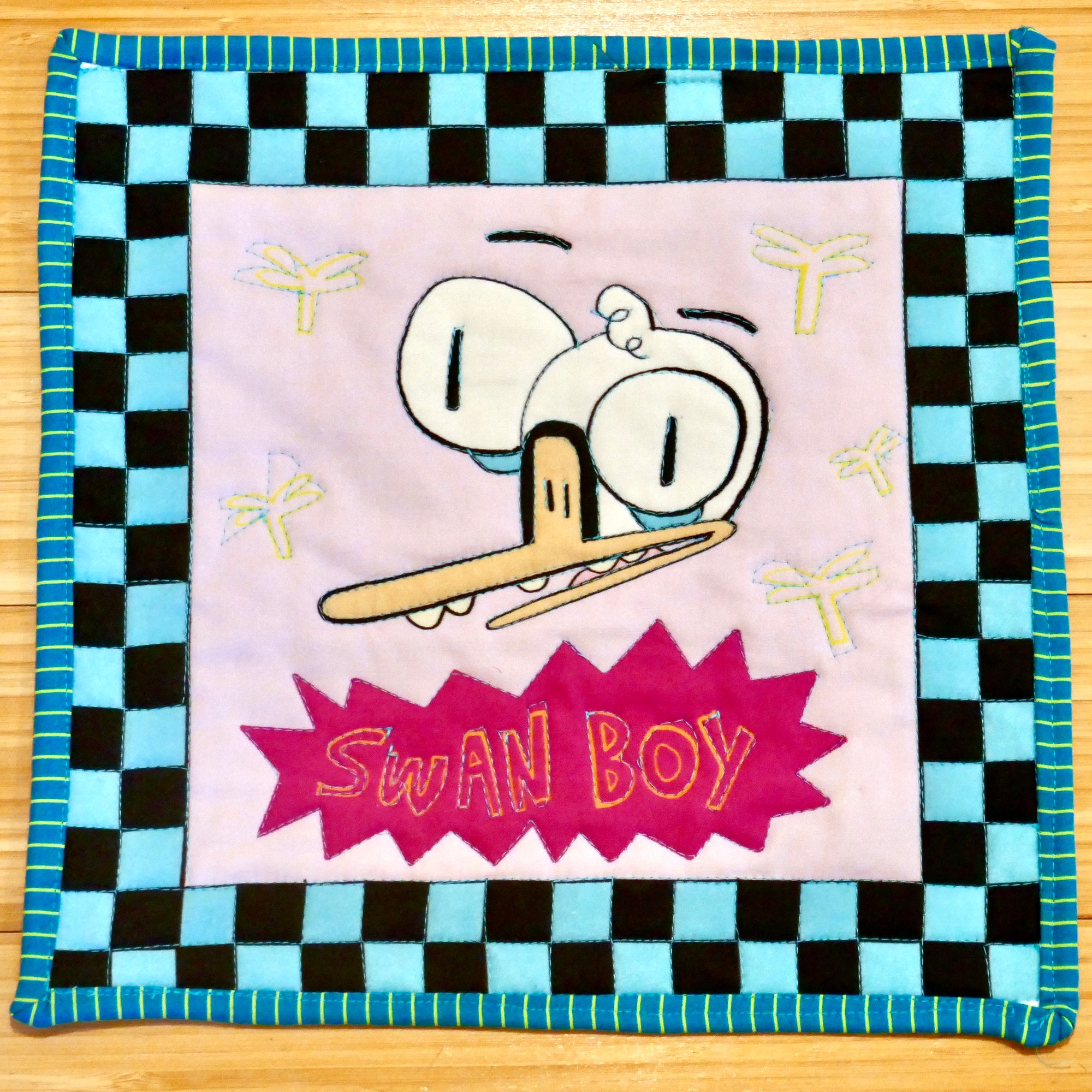 your very own Swan Boy mini quilt (about 11.75" sq) for hanging or display or tucking in your pet lizard. like Swan Boy, this specific quilt is chaotically made, so please enjoy it at a discounted price.